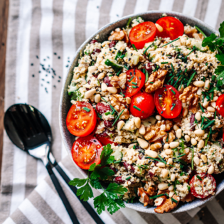 Wie Kirschtomaten, Walnüsse, Pinienkerne, ganz viele Kräuter, Kidneybohnen und ganz, ganz viel Zitronensaft. Ihr würdet nicht glauben, wie viel Zitronensaft in diesen Salat gepasst hat, so dass er endlich mal richtig angemacht geschmeckt hat, aber er ist so lecker geworden!