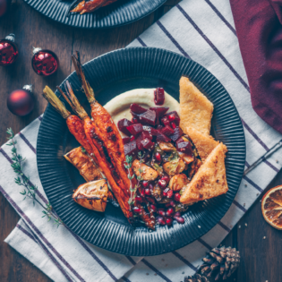 Es gibt knusprig gebratene Polentastreifen, ofengeröstete Karotten und Partisane, Rosenkohl mit geräuchertem Paprikapulver, warmen Rote Beete Salat und das alles auf einer leichten, veganen Käse-Kartoffelcreme!